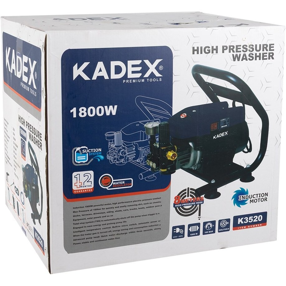 کارواش دینامی ۱۸۰۰ وات ۱۶۰ بار کادکس با موتور القایی با سیم پیچی تمام مس مناسبه برای شست و شو و سمپاشی در تمامی مصارف خانگی ، کارگاهی ، باغ و ..... دارای قابلیت سلف ساکشن با مکش بالا و استفاده آب داغ تا دمای ۴۰ درجه ، دارای تمامی اقلام و ۱۲ ماه گارانتی